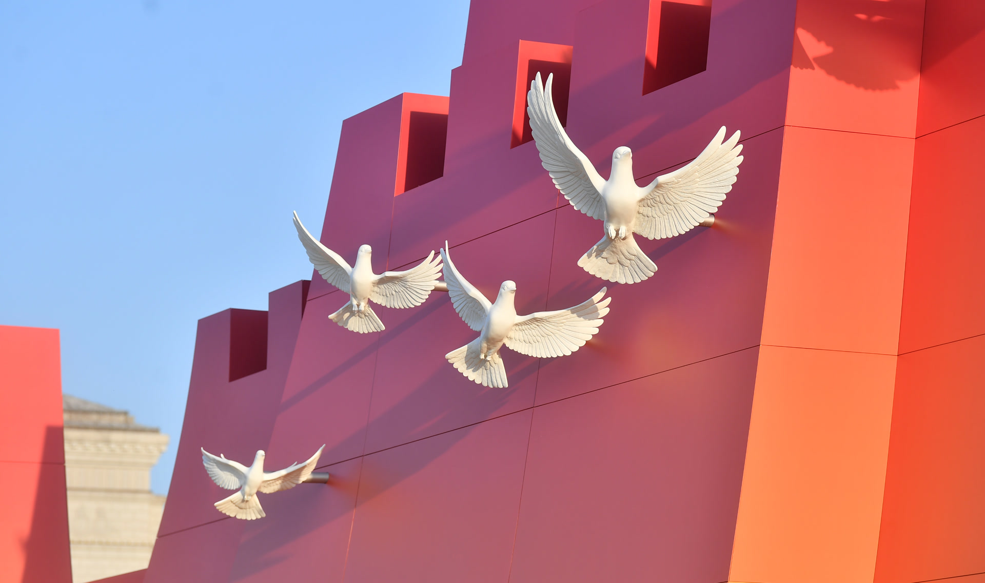 仰望年号台上的和平鸽,飞翔在长城烽燧之间,寓意着胜利与和平的到来。中央美术学院卢征远教授团队精心塑造了这14只和平鸽。自接到任务以来,卢征远专门做了和平鸽造型艺术化专项研究,观察研究鸽子真实的飞翔姿态,甚至对鸽子的骨骼和解剖结构也做了深入学习,对于经典艺术作品中的鸽子形象和中国传统艺术造型手法进行了分析和借鉴。“文献资料的考据研究要与实际观察相结合,只有眼睛才能捕捉鸽子蹦跳、滑翔、挥动翅膀等真实动作,并把这种观察和感受融入到作品创作中,才能让和平鸽具有生命力和艺术感染力。”